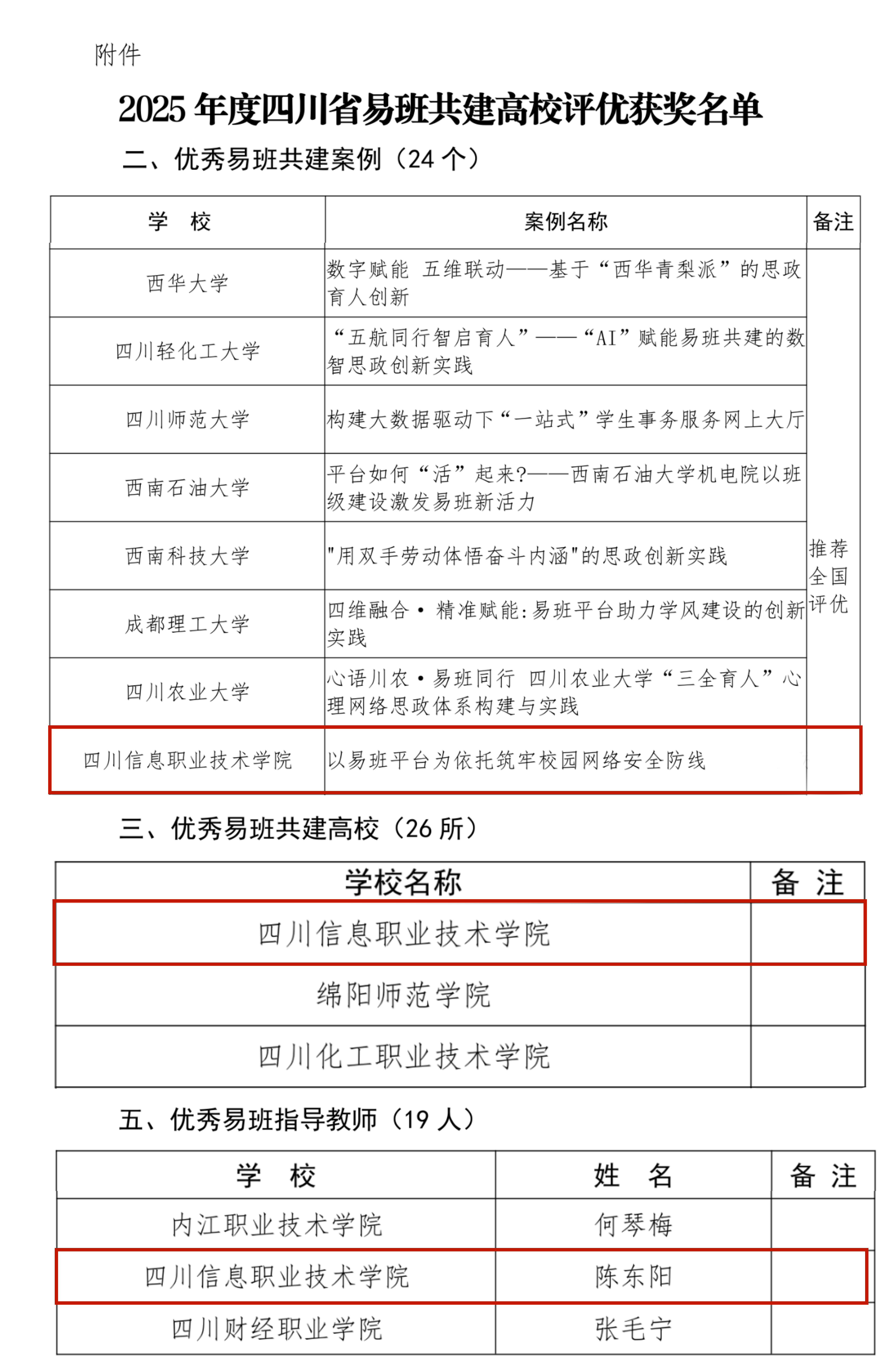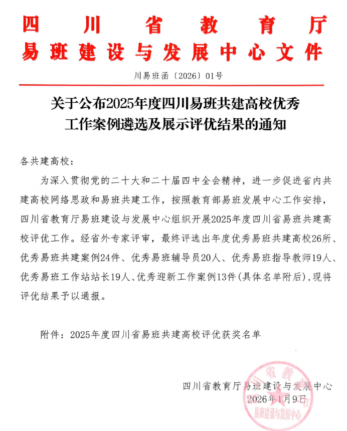 1月9日,四川省教育厅易班建设与发展中心公布了2025年度四川易班共建高校优秀工作案例遴选及展示评优结果。学院凭借在网络思政阵地建设中的扎实举措与创新实践,入选年度“四川省优秀易班共建高校”,案例《以易班平台为依托筑牢校园网络安全防线》获评“优秀易班共建案例”,并被推荐参加全国评优;同时,数字经济学院教师陈东阳获评“优秀易班指导教师”。