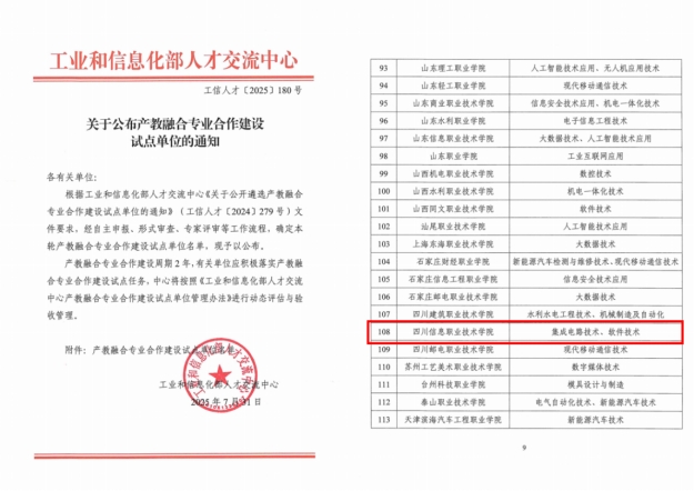 7月31日,工业和信息化部人才交流中心发布了《关于公布产教融合专业合作建设试点单位的通知》。我院集成电路技术专业与软件技术专业成功入选产教融合专业合作建设试点单位,此次全国仅144所高职院校获此资格。我院的获批既是对专业建设水平的高度认可,也为未来发展注入了新动能。