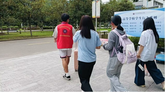在学院迎新报到点,志愿者们耐心协助新生完成信息登记、材料提交、学费缴纳等手续。同时,在校园各个路口与宿舍楼间,他们主动接过新生手中的行李,细致讲解校园布局、食堂位置、教学楼分布等实用信息,用贴心的服务化解新生初来乍到的陌生与迷茫。从清晨到日暮,红马甲的身影穿梭在校园各处,他们的笑容与问候,让新生们在初秋的微凉中感受到了家一般的温暖。