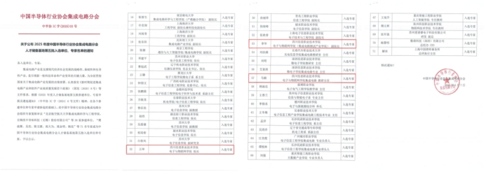 2025年9月11日,在第27届中国集成电路制造年会暨供应链创新发展大会(CICD 2025)上公布了第五批人才储备基地入选单位及专家名单。我院成功入选“人才储备基地”共建单位。同时,电子与物联网学院院长王坤、副院长李华、集成电路教研室主任马颖入选专家库成员。