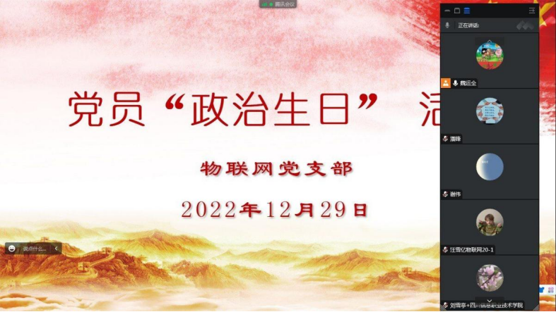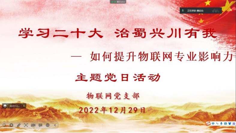 为深入学习好、宣传好、贯彻好党的二十大精神,12月29日物联网党支部组织全体党员线上开展了学习“学习二十大 治蜀兴川有我”主题党日活动。活动由物联网党支部书记魏运全同志主持,电子与物联网学院党总支书记张德忠和党支部全体党员参加了会议。