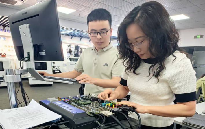 在长达四天的深度技术学习与研讨中,校企双方重点围绕"数字芯片设计“和”芯片自动化测试"这两个赛项核心模块展开攻关。广州慧谷技术工程师演示了自主研发的高精度测试平台,完成数字芯片的设计、验证与检测流程。马颖主任详细了解了设备的工作原理、参数指标,并带领团队完成全流程实操验证,成功实现数字芯片的设计与自动化测试。