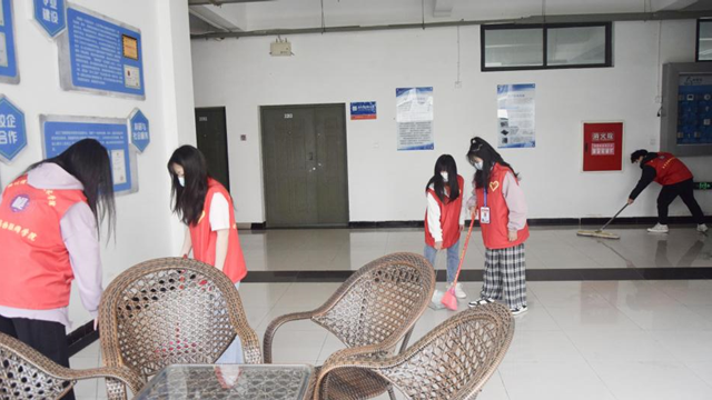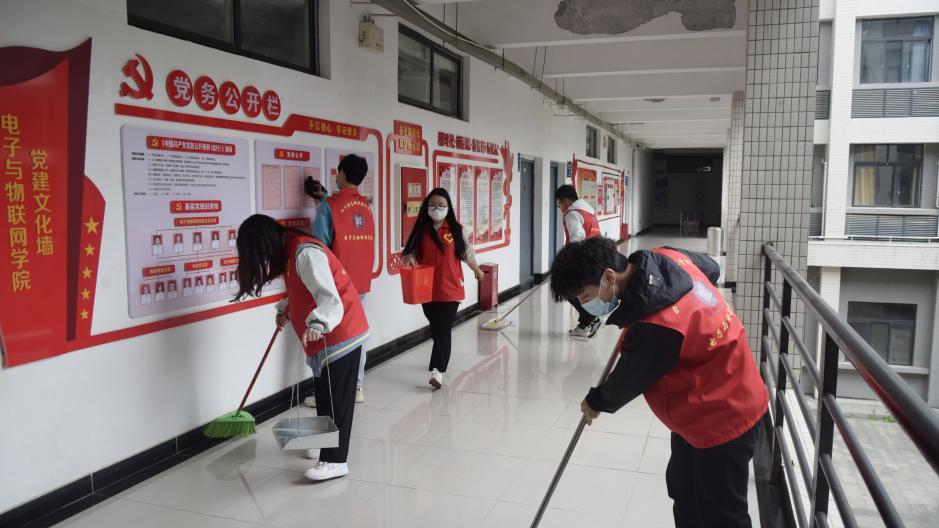 活动中,志愿者们身穿红马甲,秉承认真、耐心、细心的原则,有序对电子楼的会议室、楼道、阳台、宣传栏以及办公室进行了彻底保洁,营造了一个舒适而温馨的生活学习环境。