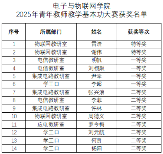 根据《电子与物联网学院关于举办2025年青年教师教学基本功大赛的通知》,现对我院2025年青年教师教学基本功大赛获奖名单进行公示。公示期为1月15日至17日(3个工作日)。如对公示结果有异议,请在公示期内通过电话向二级学院领导反映。
