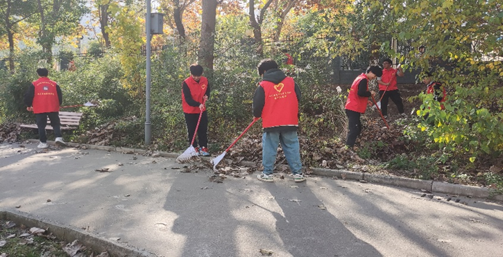 活动中,志愿者们身穿红色马甲,手拿耙子、扫帚、口袋等工具认真细致地针对学校绿化带及道路上的落叶进行了全面清理,经过3个小时的辛勤劳动,绿化带的环境焕然一新。