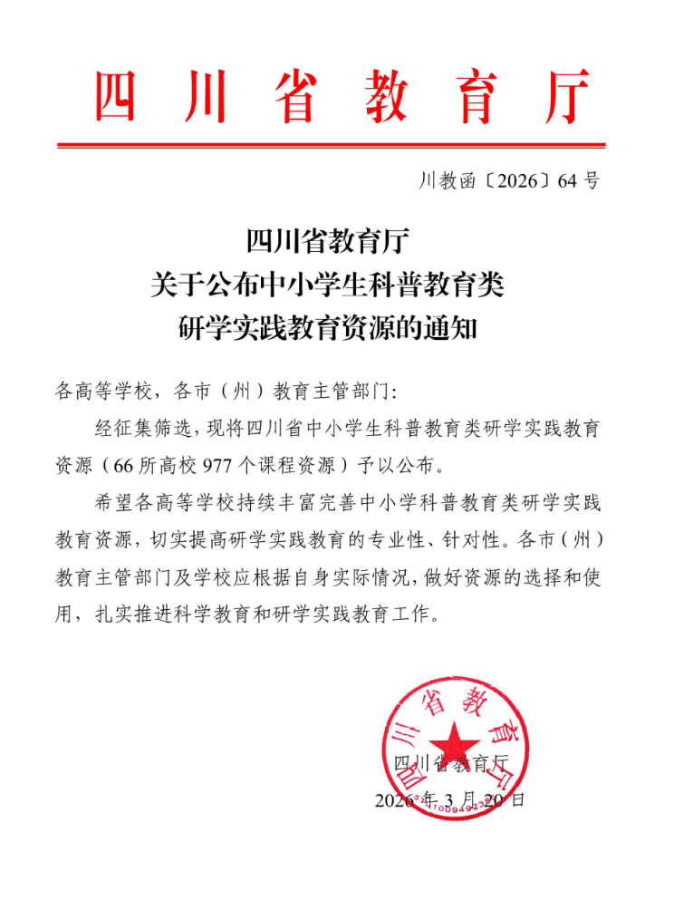 3月20日,四川省教育厅发布了《关于公布中小学生科普教育类研学实践教育资源的通知》,学院申报的《从沙粒到芯片》《数学3D建模》等8项课程资源成功入选“四川省中小学生科普教育类研学实践教育资源”名单,标志着我院优质教学资源正式面向全省中小学生开放,服务基础教育科普工作迈上新台阶。