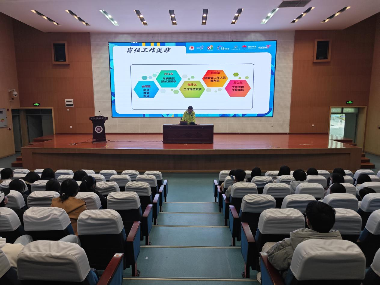 前期,院团委联合组委会组织开展了志愿者动员大会,团市委、体育局、学院分管领导出席动员大会并分别作了动员讲话;赛前,学院围绕赛事流程、岗位职责、服务标准、注意事项等内容,对各岗位志愿者进行了多轮次专题培训,为上岗服务做好充足准备。