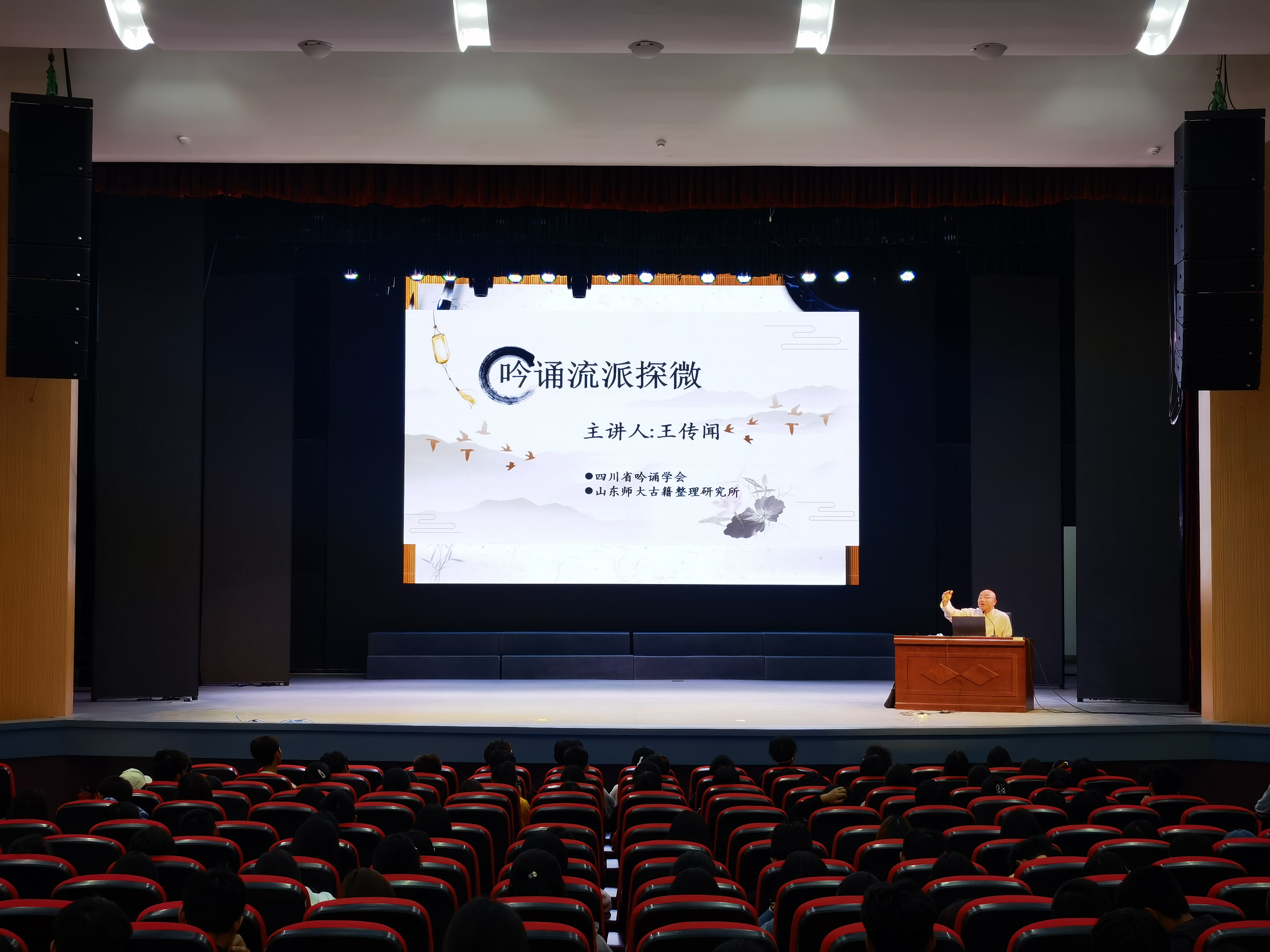 11月2日,学校语委会联合数字经济学院在东坝校区礼堂举办以《吟诵流派微探》为主题的第五期“经”彩讲坛。本次讲座特邀请中华吟诵理事、四川吟诵学会会长王传闻博士主讲。全体2023级学生和2022级旅游专业学生聆听讲座。