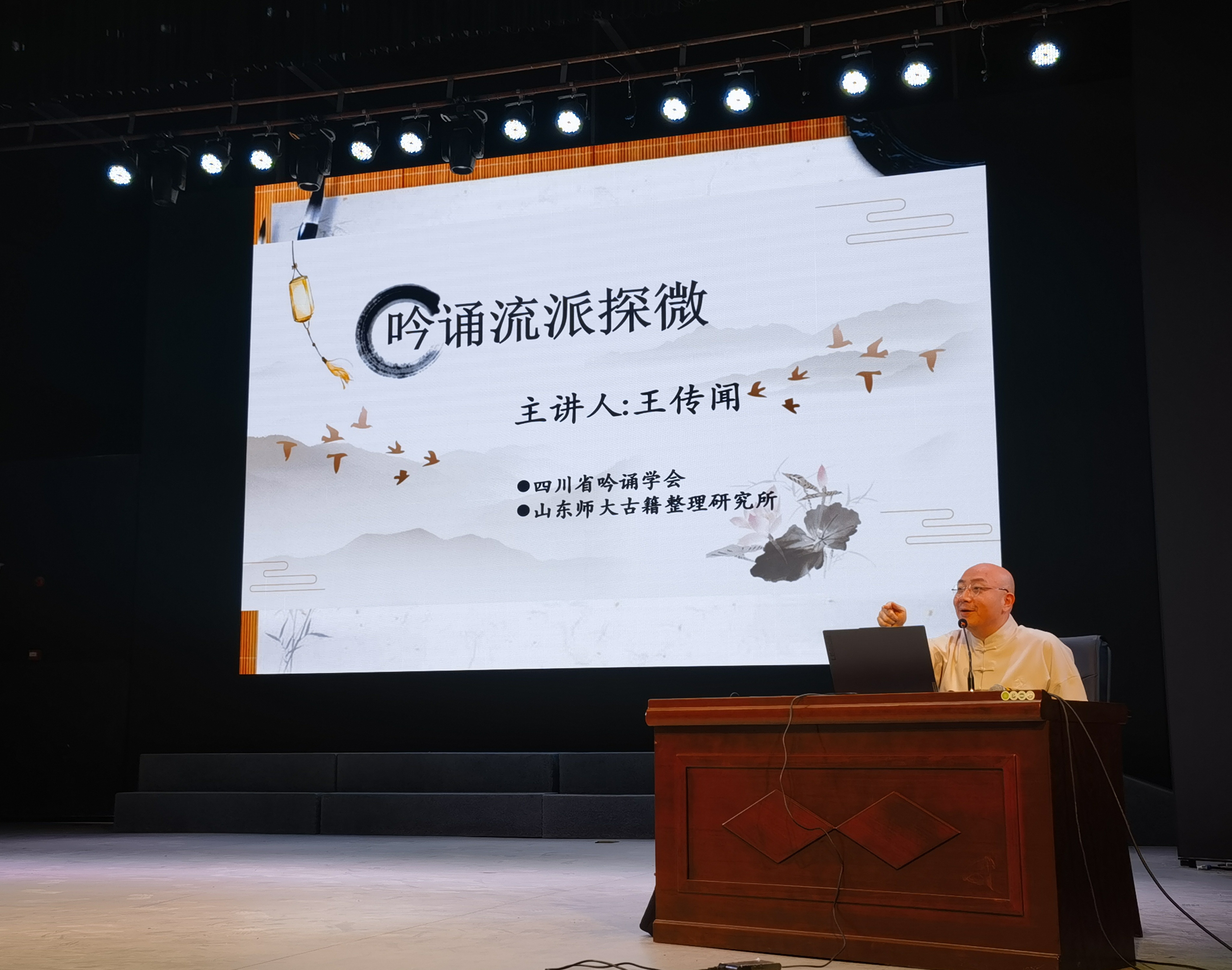 讲座中,王传闻介绍了吟诵发展历史,并对各地吟诵的不同发声特点作了讲解,让师生深刻认识到吟诵在中华传统文化传承中的重要地位。他指出,方言的声调决定了吟诵主旋律的生成和走向,因此吟诵具有极强的文化教育功能和研究价值,并现场示范各派不同的吟诵调,通过带读让师生感受到中华传统文化的无限魅力。